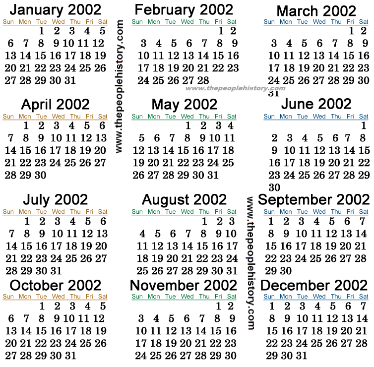 All 12 months of 2002 on a single page. All sizes, even big 11x17, poster, and legal size. Online monthly calendar 2002 and printable 2002 holiday calendar are also. Yearly calendar showing months for the year 2002. Free, downloadable, and printable 2002 calendar pdfs.