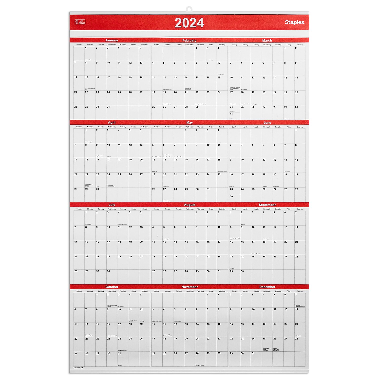 2025 Staples 24" x 36" Wall Calendar, Red (ST5845125) Staples
