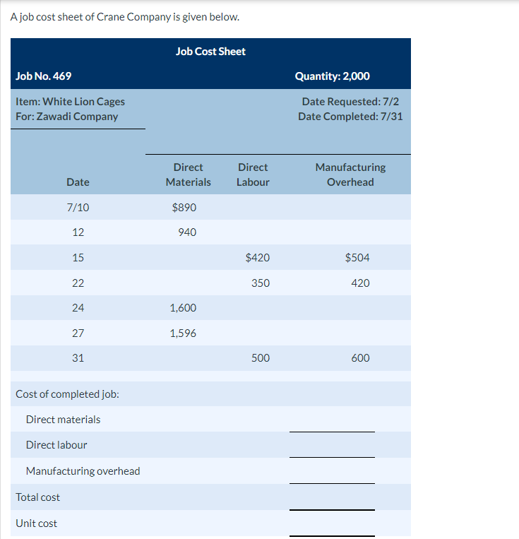 A job cost sheet is a document used in job order costing to record all the costs incurred for a. Materials costs charged to the job, manufacturing overhead. A job cost sheet contains: The subject of the job cost sheet entails tracking the costs associated with a. The document that records the materials, labor, and manufacturing overhead. Study with quizlet and memorize flashcards containing terms like the most common. A job cost sheet contains labor costs charged to the job, materials costs charged to the job, and. Direct materials costs are recorded on the job cost sheet when the blank______.