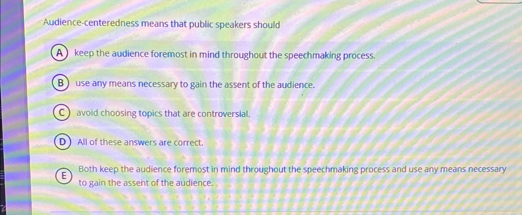 Audience Centeredness Means That Public Speaker Should - Study with quizlet and memorize flashcards containing terms like audience.