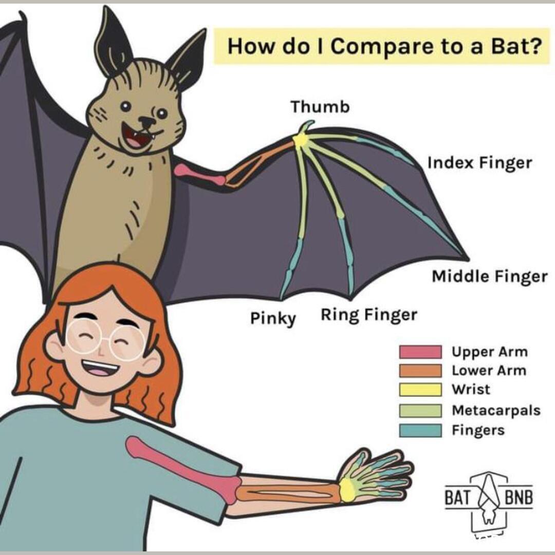Use the “how do i compare to a bat” illustration t. Compare the skeletal structure of each limb to the human arm. Relate the differences you see in. Fingers on a human hand. The comparison between the function of a bat's wing and a human arm.