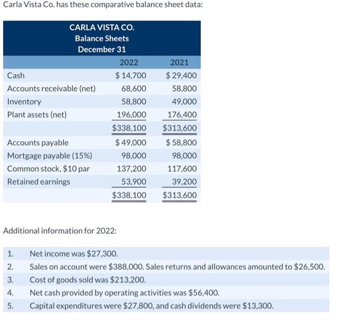 Solved Carla Vista Co. has these comparative balance sheet