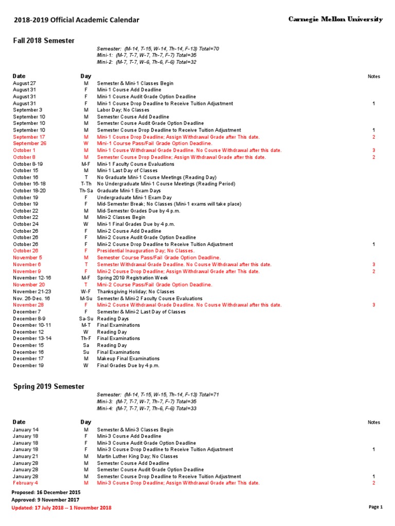 20182019 Official Academic Calendar Carnegie Mellon University Fall