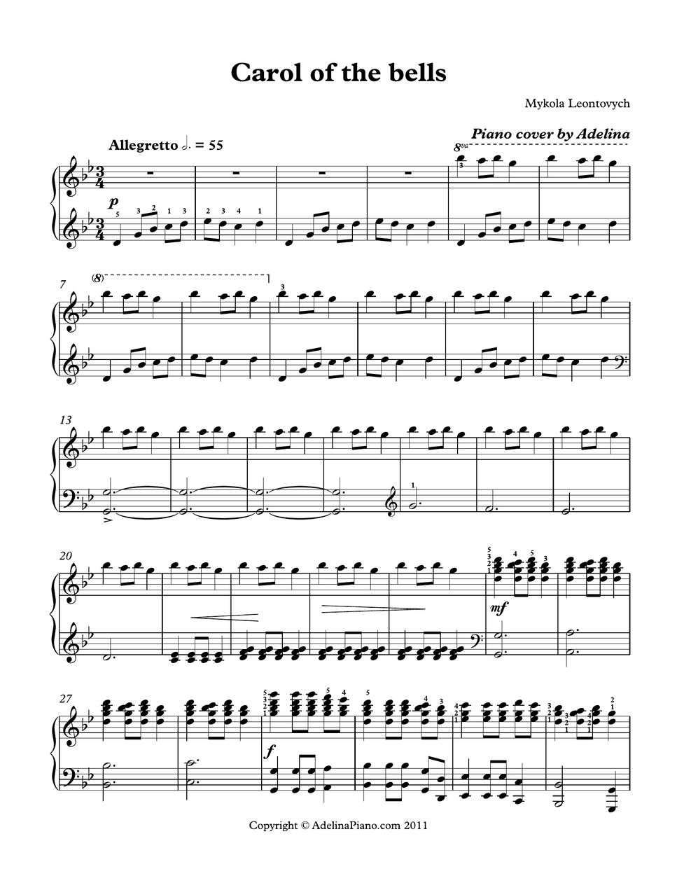 Christmas Carol Carol Of The Bells Sheet by Adelina Piano
