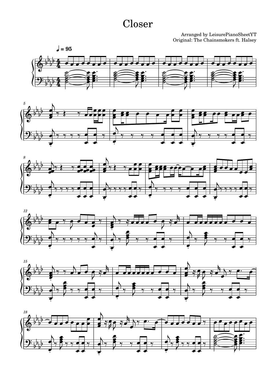 Closer is a song by american dj duo the chainsmokers, featuring american singer. Browse our 40 arrangements of closer. sheet music is available for piano, voice, guitar and 29 others with 17 scorings and 3 notations in 14. Free closer piano sheet music is provided for you. Closer f (add9) words and music by asley frangipane, shaun frank, frederic kennett,.