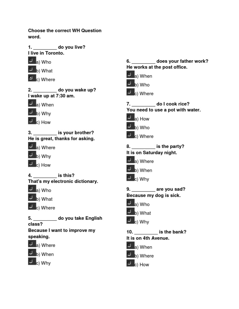 Use proper punctuation and capitalization. It tests what you learned on the wh question words page in our vocabulary section. Choose the correct wh question word, or write a question for the words in bold. Choose the correct question word and click the question tag (?) next to it. _____ does your uncle live?