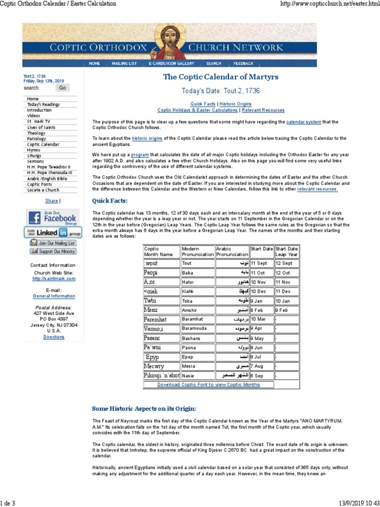 The Coptic Calendar of Martyrs Today's Date Tout 2, 1736 PDF