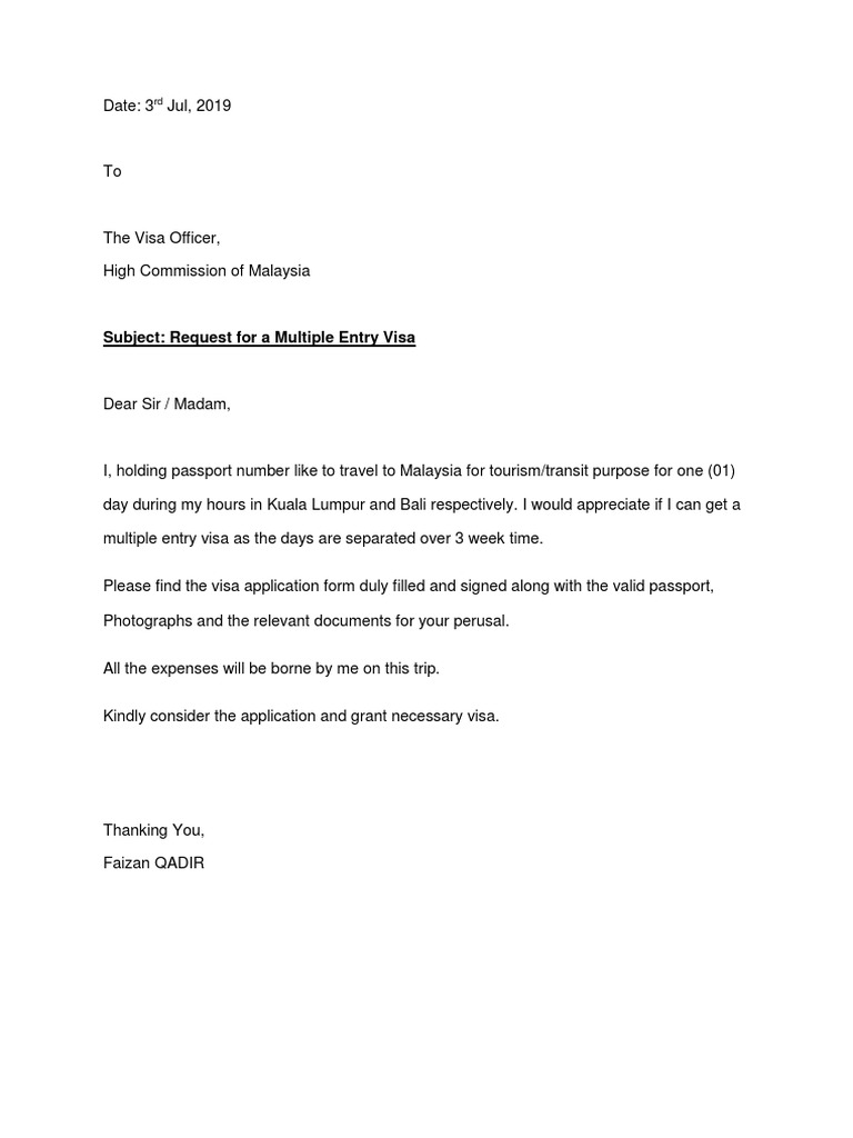 Dear sir / madam, i, _________________ (name as on passport) holding indian passport number __________ ____. What is a visa cover letter? A visa cover letter is a personal statement addressed to the consulate or embassy, submitted alongside. It can be quite difficult. Just like with most countries, malaysia requires individuals applying for a visa to submit a cover letter.