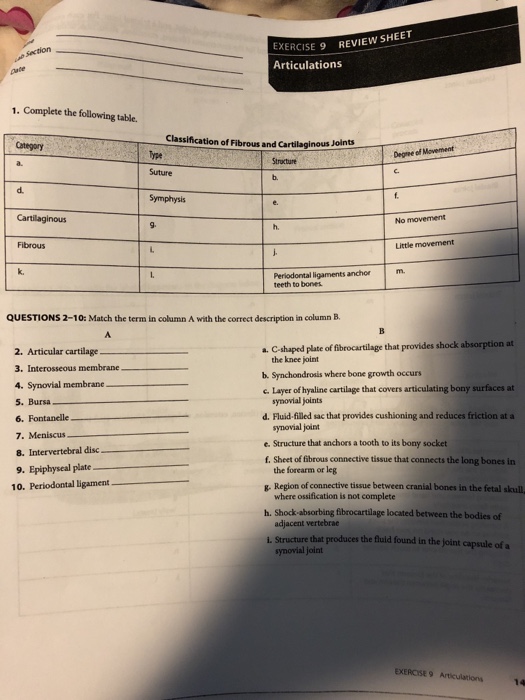 Solved EXERCISE 9 REVIEWw SHEET Articulations section 1.