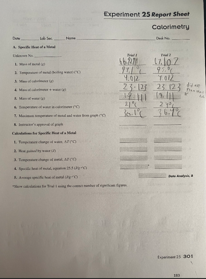 Solved Experiment 25 Report Sheet Calorimetry Desk No. Name