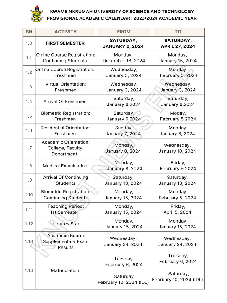 Provisional Academic Calendar 2023 2024 Academic Year Knust News PDF