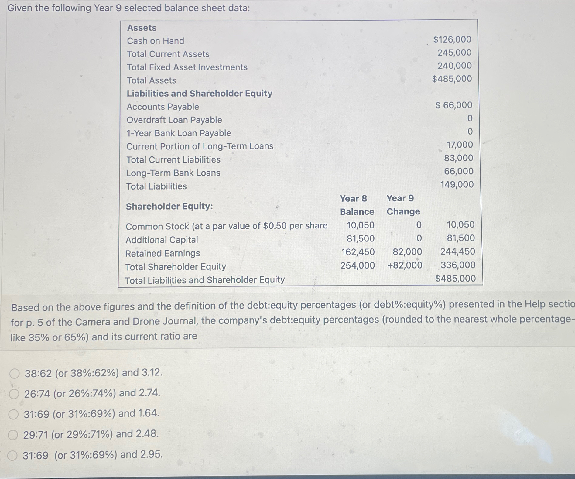 Given The Following Year 9 Selected Balance Sheet Data - In this solution, we are asked to compute for the company's debt to equity ratio and current ratio using the given information. It is computed by dividing the entire liabilities of the business by the total. One indicator of a company's financial leverage is its debt proportion. There are 2 steps to solve this one. The data provided does not directly give us this figure, but we can infer it from the balance sheet data. Total liabilities are the sum of current.