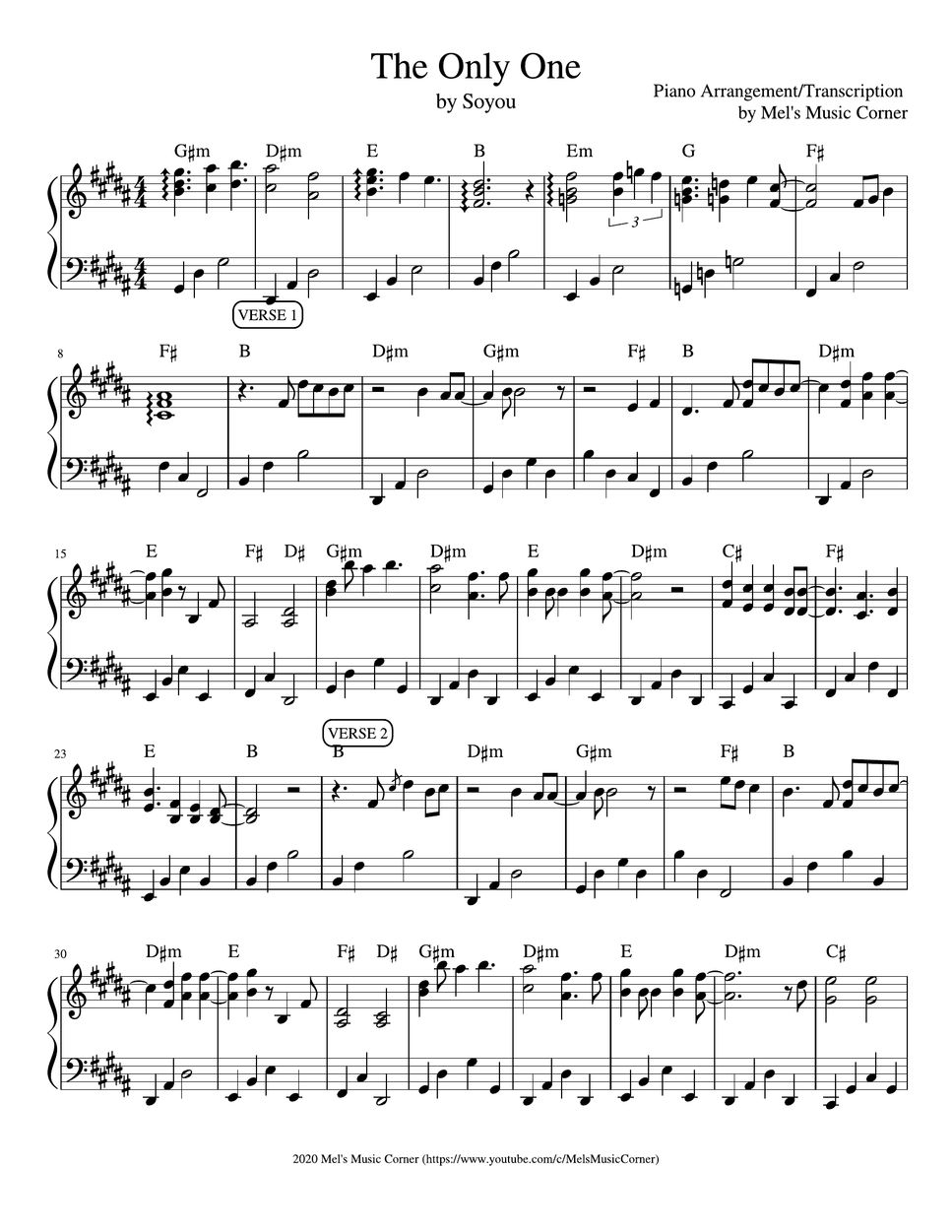 Soyou The Only One (piano sheet music) Sheets by Mel's Music Corner