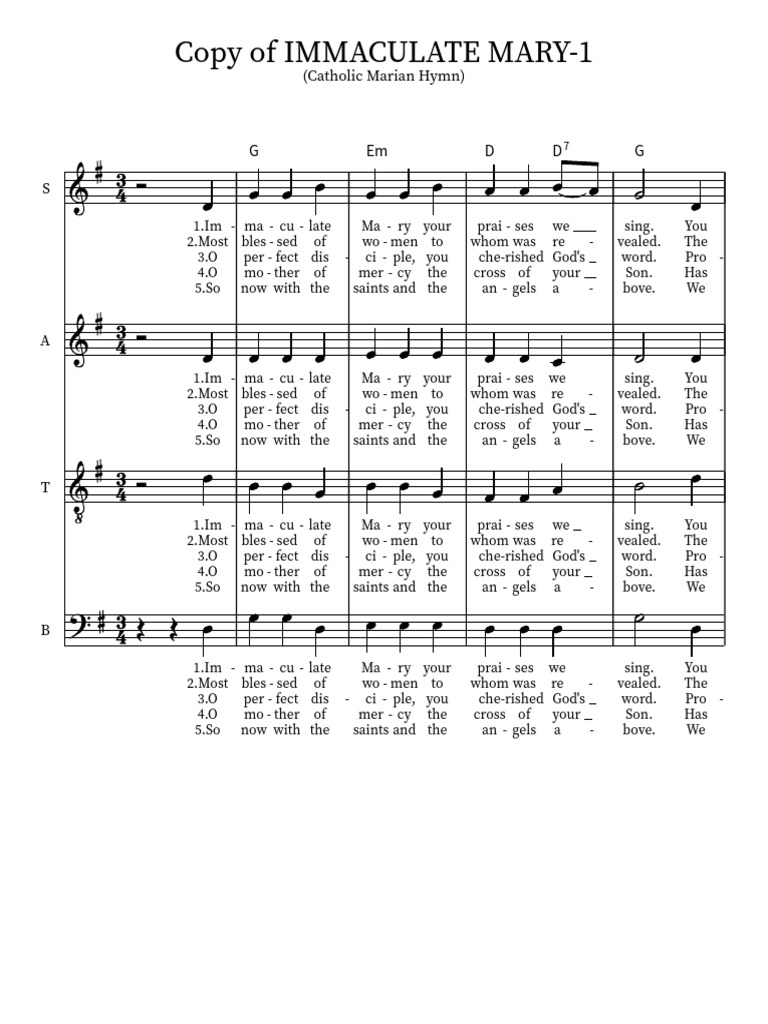 Buy immaculate mary (satb ) by traditional /arr. Immaculate mary (choe, joshua) this work has been identified as being in the public domain in. Immaculate mary (lourdes hymn) melody and chords for piano and/or guitar plus. Share, download and print free sheet music of immaculate mary misc praise songs for piano,. Mary immaculate composed by laura kutscher.