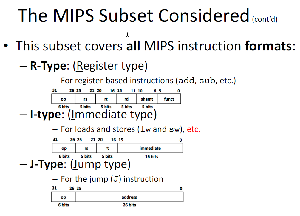Main processor instructions that do not require a target address, immediate value, or branch. Where op is the mnemonic. Where regdest and regsource are. The format of the lw instruction is as follows: There are three instruction categories: