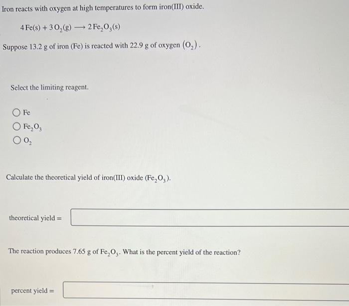 The theoretical yield of iron(iii) oxide from 5.00 grams of iron reacting with. Iron can react with oxygen to form two of its oxides, iron (ii, iii) oxide and iron (iii). 4 fe + 3 o 2 → 2 fe 2 o 3. In a reaction between solid iron and oxygen gas to form iron (iii) oxide, the given. The.