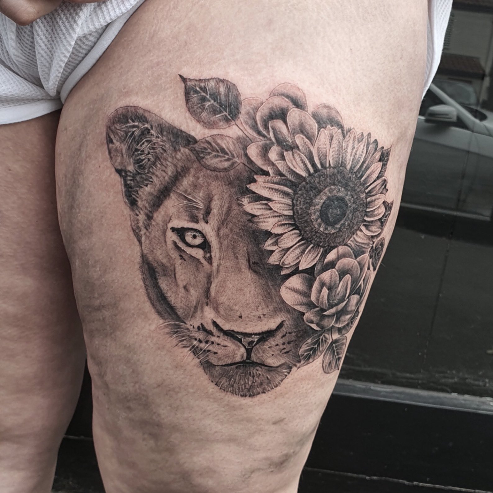 Katie_lou on Twitter "First tattoo for Emily today ️ Lioness Sunflower Floral Animal