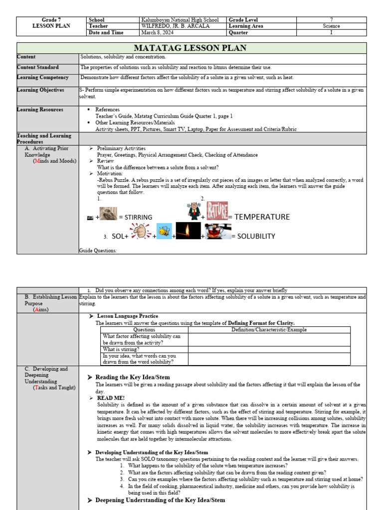MATATAGLESSONPLANForDemo PDF Solubility Learning