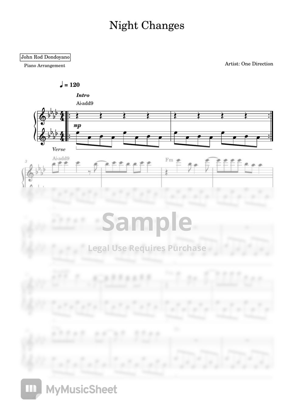 One Direction Night Changes (PIANO SHEET) 악보 by John Rod Dondoyano