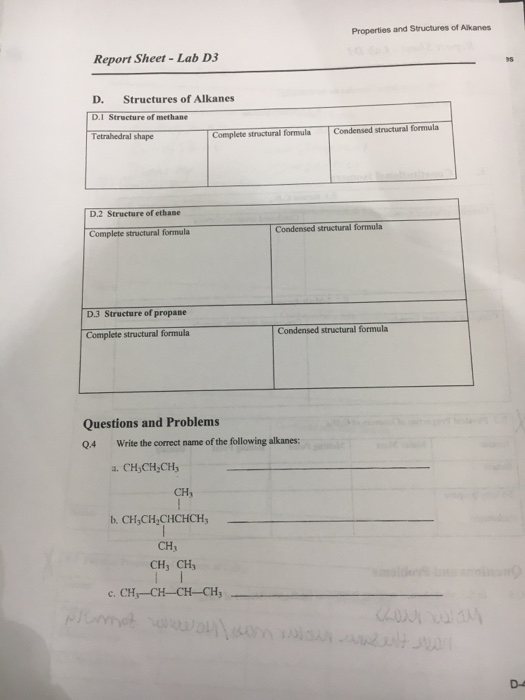 Organic Compounds Alkanes Report Sheet - Provide names and structures for the molecules as instructed. Write these observations (color changes, appearance of crystals, formation of an emulsion, boiling temperatures, test results, etc.) in your. Construct a model for each of the molecules represented on the report sheet. Alkanes i need help with the questions marked with a red asterisk *