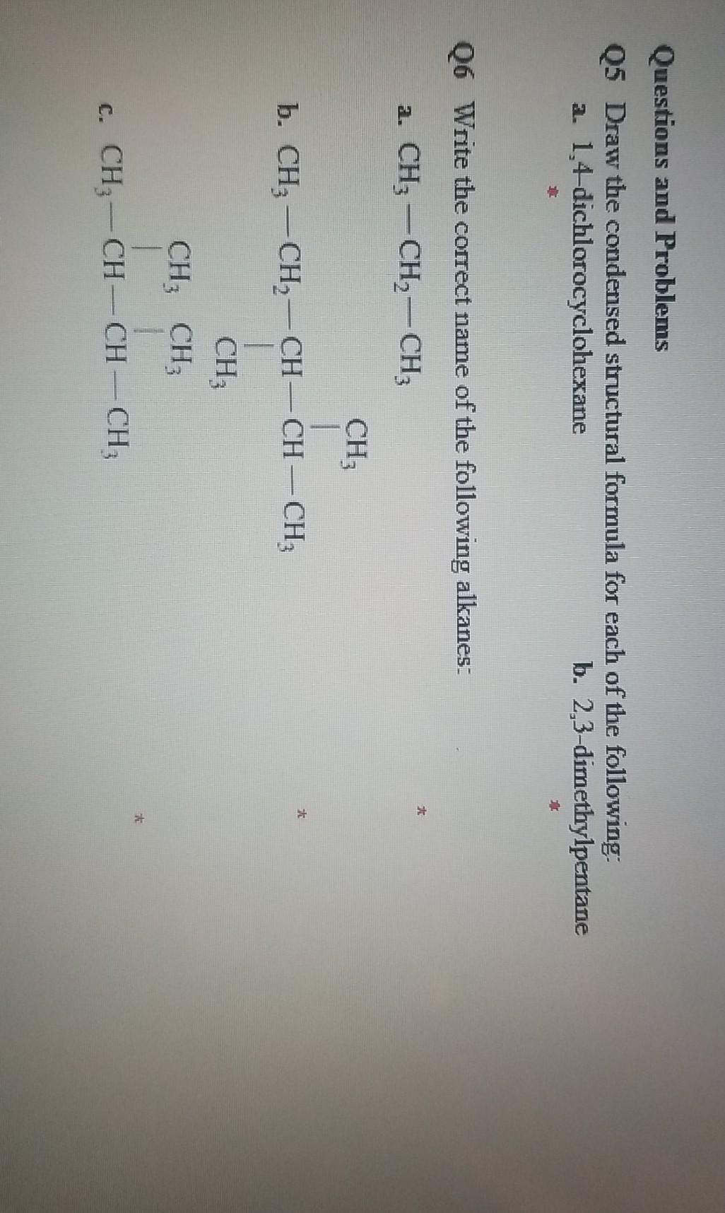 Construct a model for each of the molecules represented on the report sheet. Alkanes i need help with the questions marked with a red asterisk * Write these observations (color changes, appearance of crystals, formation of an emulsion, boiling temperatures, test results, etc.) in your. Provide names and structures for the molecules as instructed.