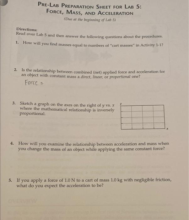 Solved PreLab Preparation SHEET FOR LAB 5 FORCE, MASS, AND