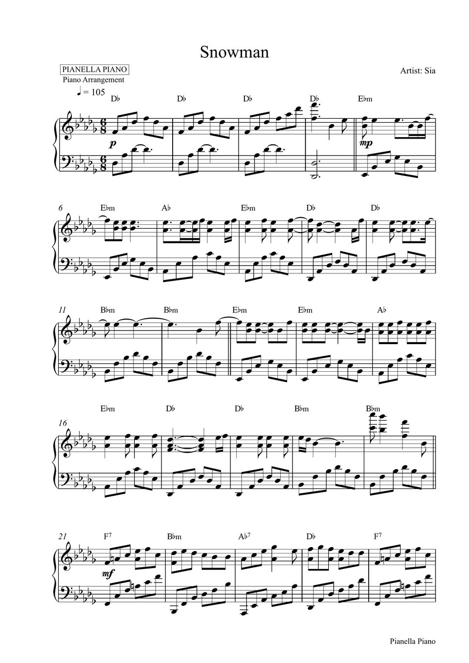 Sia Snowman (Piano Sheet) Sheets by Pianella Piano