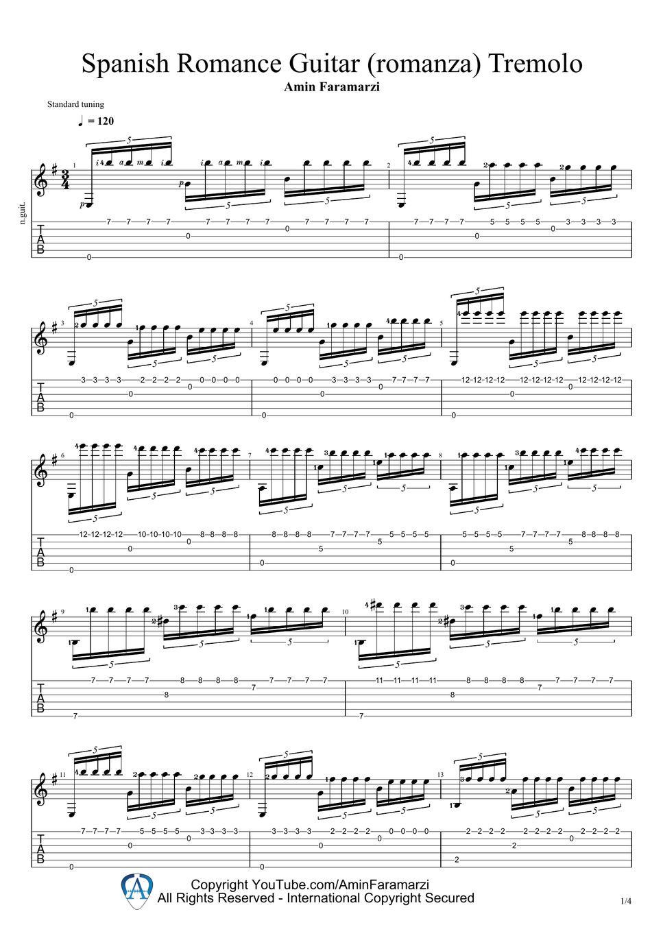 Anonymous Spanish Romance Guitar ( romanza ) Tremolo Sheet by Amin