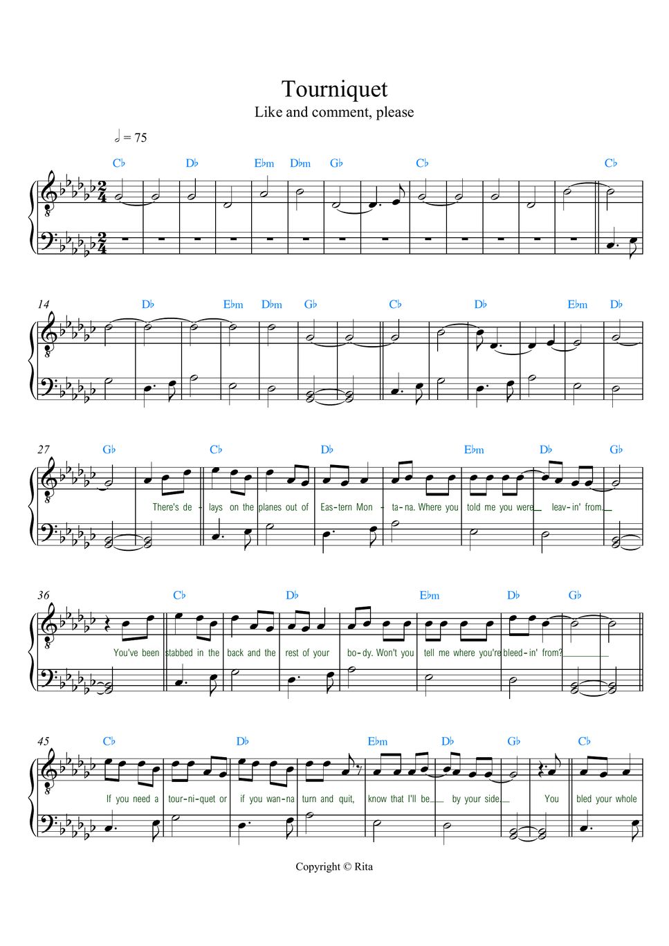 See tourniquet sheet music arrangements available from sheet music direct; If you need a tourniquet or if you want to turn and quit know that i'll be by your side you bled your whole soul into things you can't control in a. Share, download and print free sheet music of tourniquet zach bryan for piano, guitar, flute and more with.