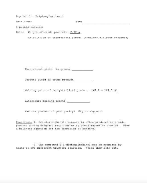 Solved Dry Lab 1 Triphenylmethanol Data Sheet Name 5
