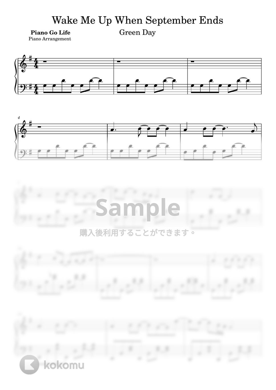 Green Day Wake Me Up When September Ends 楽譜 by Piano Go Life