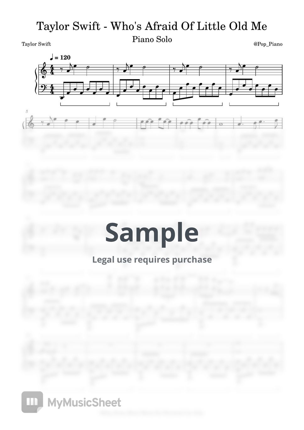 Taylor Swift Who's Afraid Of Little Old Me Sheets by Pop Piano