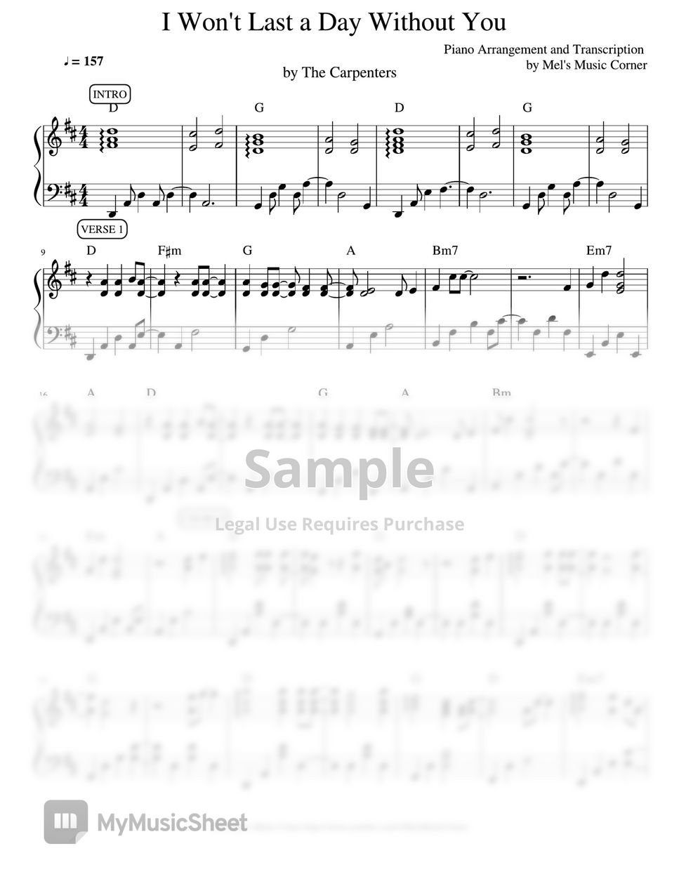 The Carpenters I Won't Last a Day Without You (piano sheet music